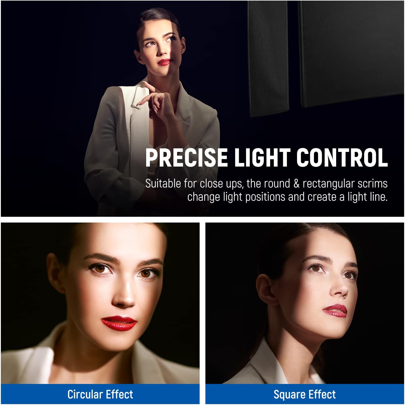 •  Deux scrims ronds (points) de 16 cm de diamètre et deux canevas rectangulaires de 10 x 35,5 cm (doigts) sont adaptés pour les petits environnements de prise de vue. Leur fonction est d’ajuster finement les positions de la lumière et d’éviter les reflets, permettant aux photographes de contrôler avec précision la lumière et de créer des ombres sombres ainsi que des reflets lumineux